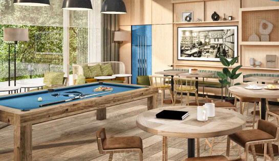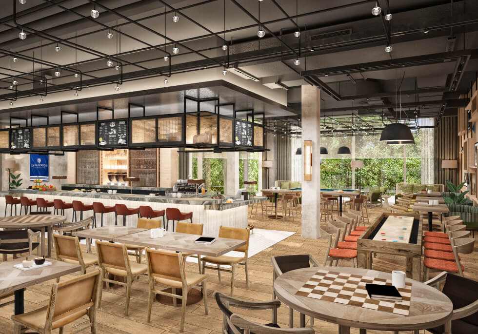 An open, light-filled space with patio, lounge, bar, and tap room to serve as a social hub for students.