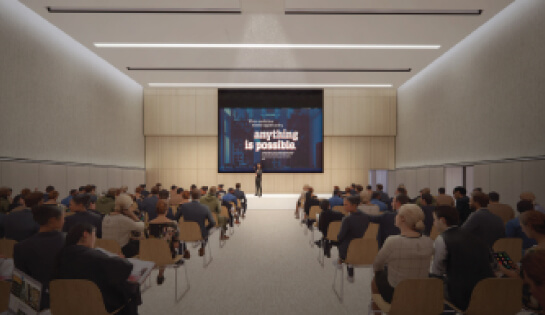 Large, flexible event spaces featuring warm tones, carpet floors, and blackout shades.