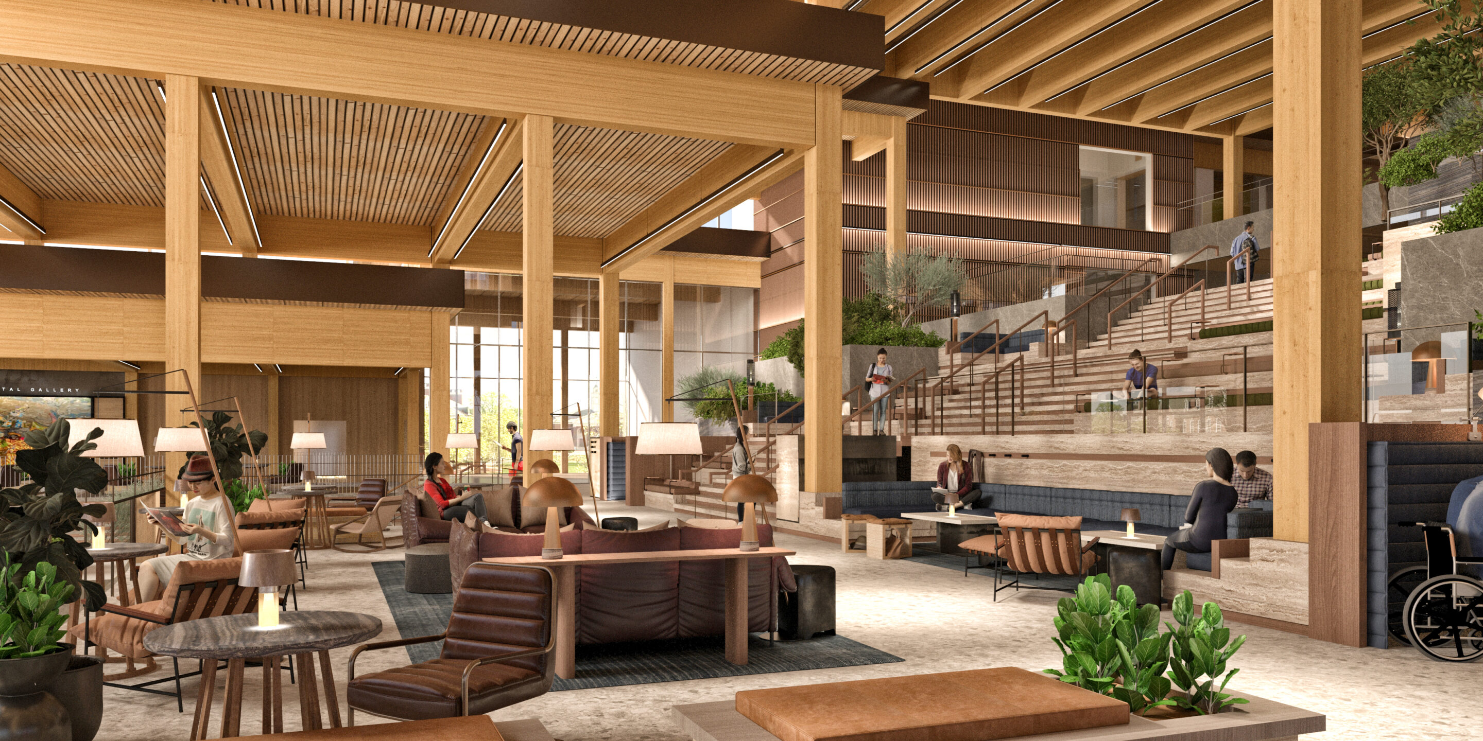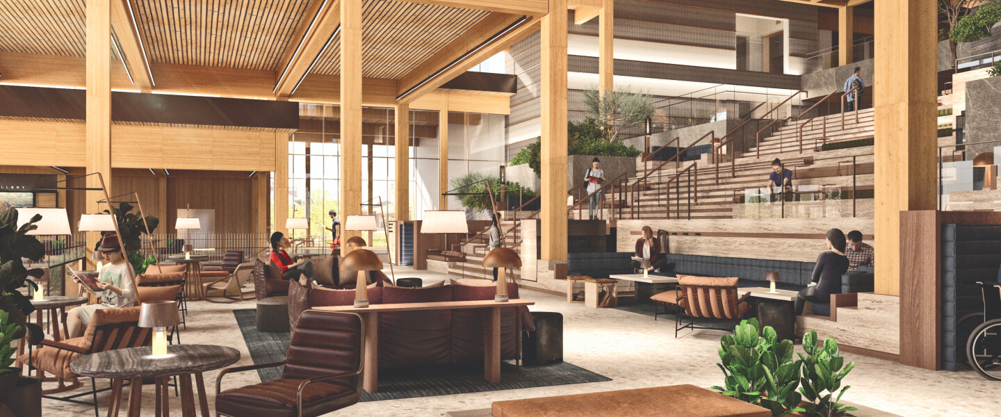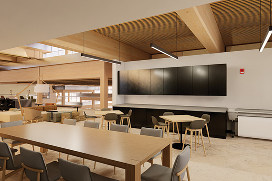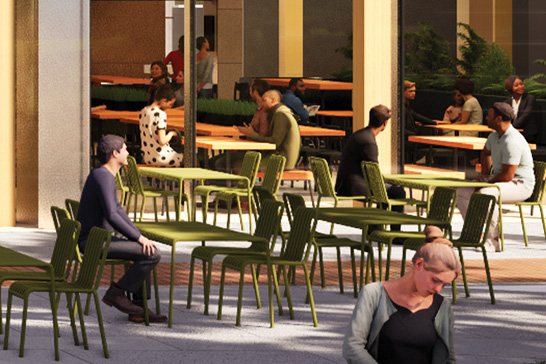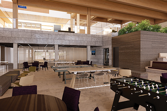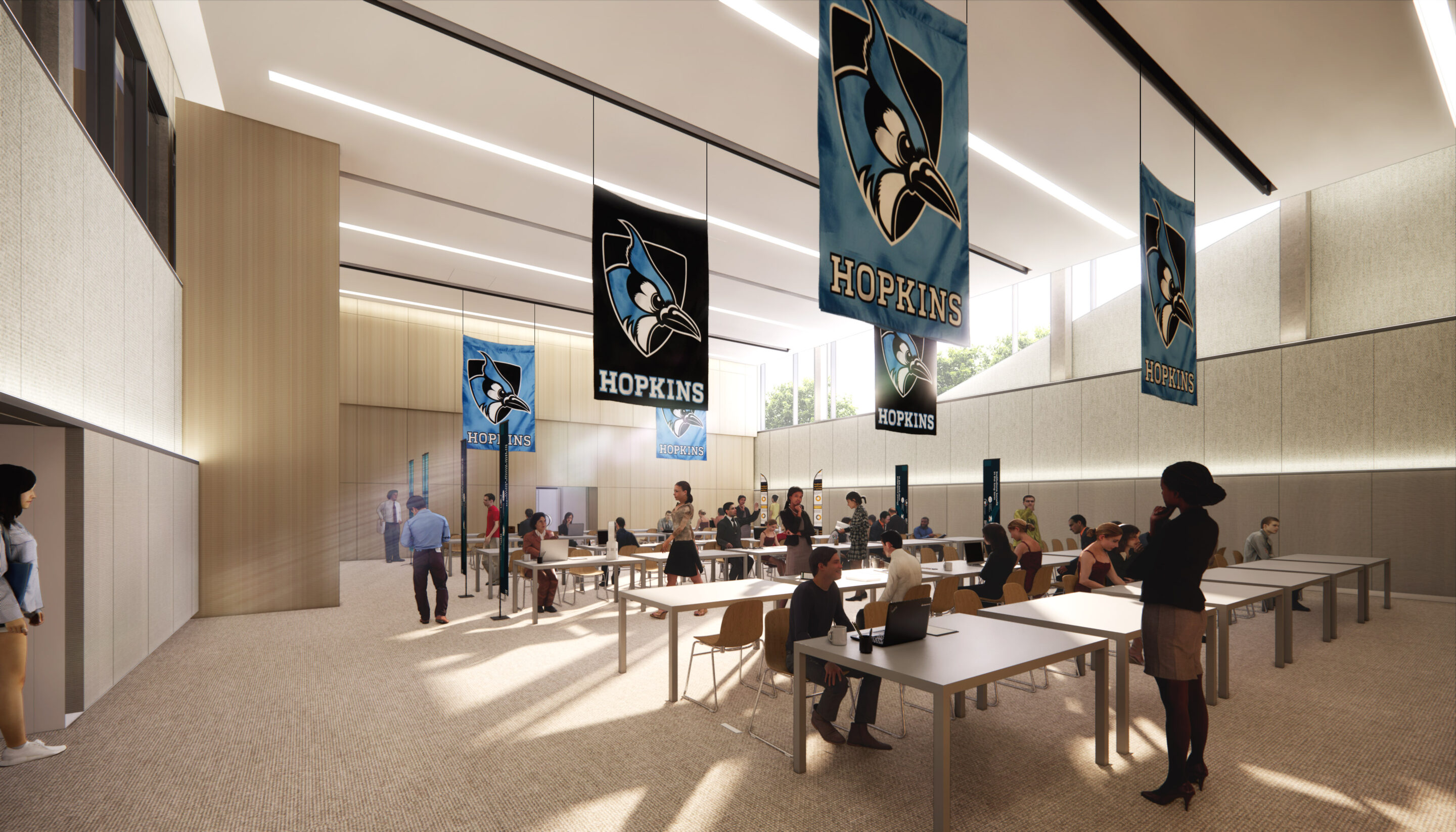 Along with the signature “living room” space, the building will feature a food hall with a variety of local vendors and dining options. Student resource centers, support services, and flexible meeting rooms for the university’s more than 400 student organizations ensure this new space will amplify our impact. From studio spaces and sound-treated practice and recording rooms to a gaming lounge and hangout spots, the center meets a need expressed by generations of Hopkins students: a place of their own.