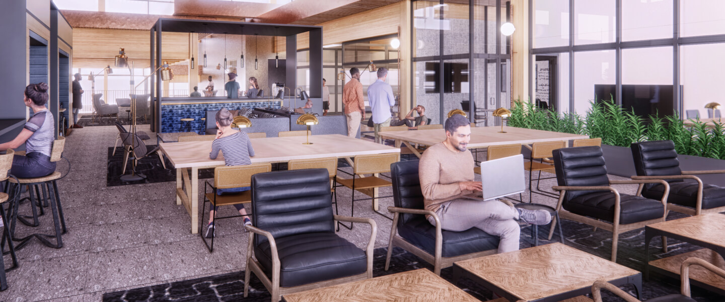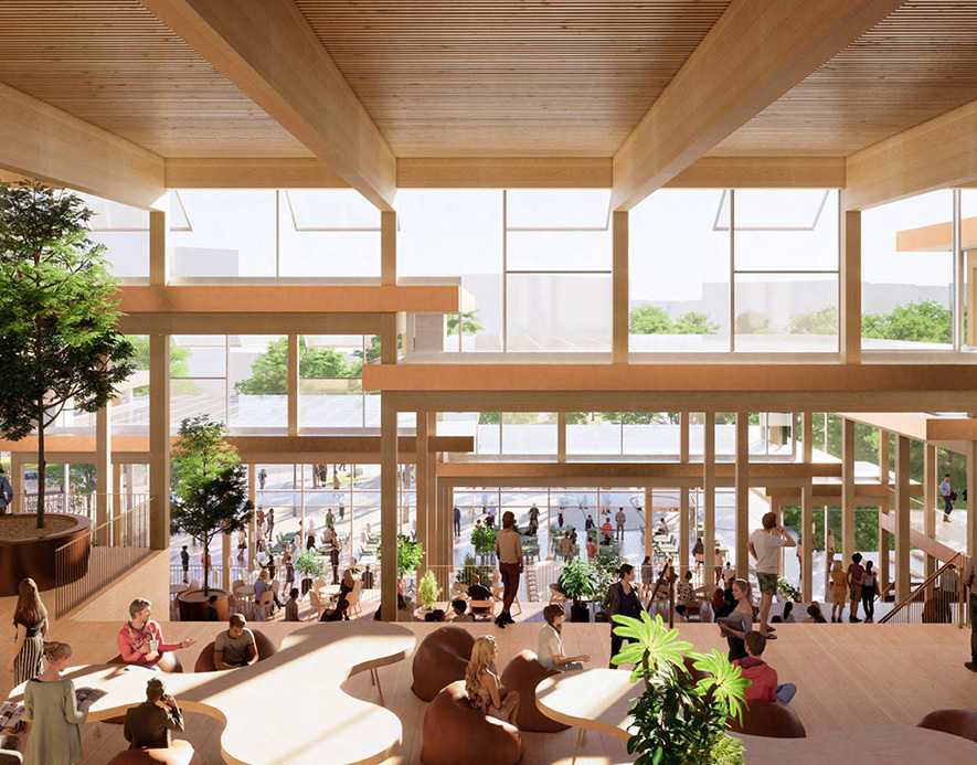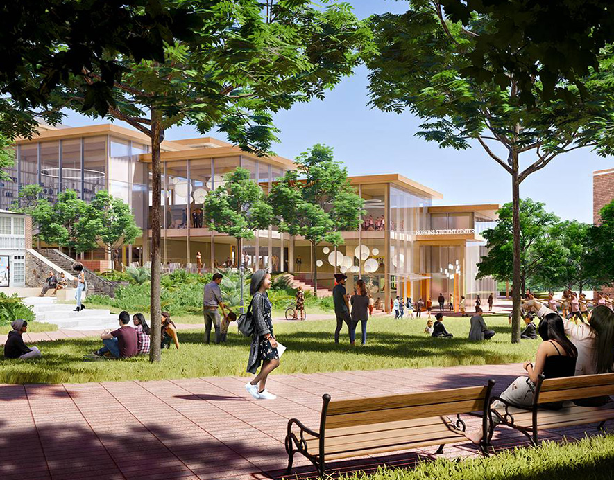 The concept, submitted by the international architectural firm Bjarke Ingels Group, features an open design with a large central campus living room, a variety of social spaces, themed community lounges, art and enrichment spaces, and dining options.